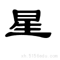 星 xīng 天文学上指宇宙间能发光的或反射光的天体;一般指夜间天空中发光的天体:星球。恒星。行(x妌g )星。卫星。披星戴月。 细碎的小颗粒东西:火星儿。 秤等衡器上记数的点:定盘星。 军官衣领上的徽记:五星将军。 形容夜间:星行。星奔。 星名,二十八宿之一:星宿。 像星一样排列,分散:星星点点。 喻某一方面新出现的杰出人物:影星。歌星。 古代妇女面上所饰的花点。 以星象推算吉凶祸福的方术:星术。星相(xi刵g )。 原子核物理学上指高能粒子射入核乳胶或云室、气泡室时发现有许多径迹从一点发出的现象。 国际通用的衡量宾馆、饭店的等级标准:星级。五星饭店。 笔画数:9; 部首:日; 笔顺编号:251131121 |